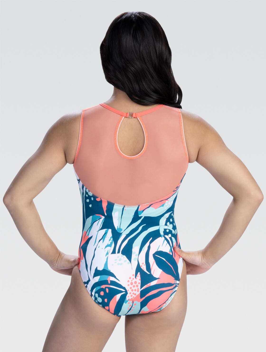全体にデザインされた花と鎖骨から背中にかけて使用されているピーチピンクのメッシュが特徴的なレオタードです。